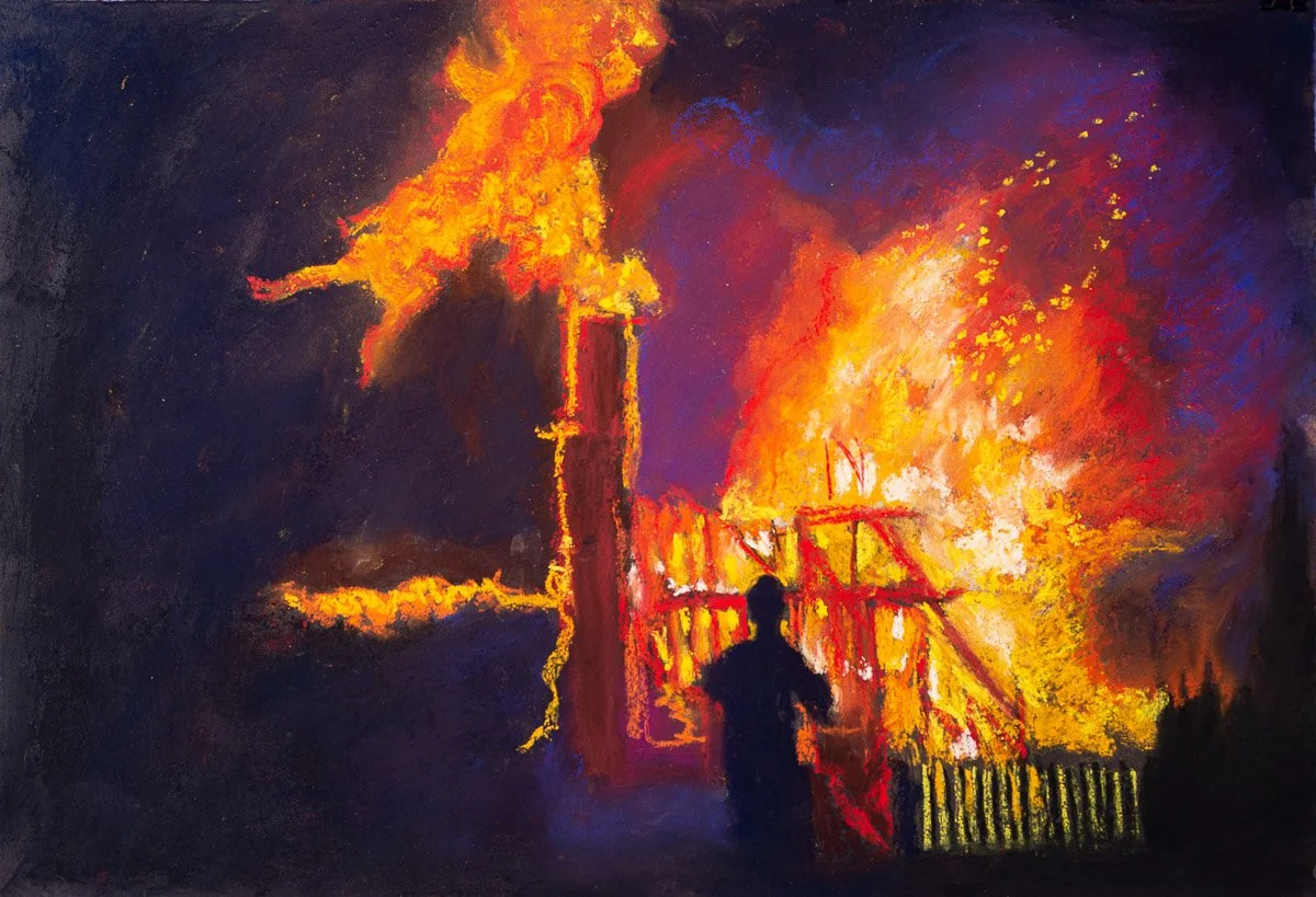 Fire in the Night.2019. Pastel on Paper. w 30 x h 22.5 in. (framed w 37 x h 34 in.). Available $4,500